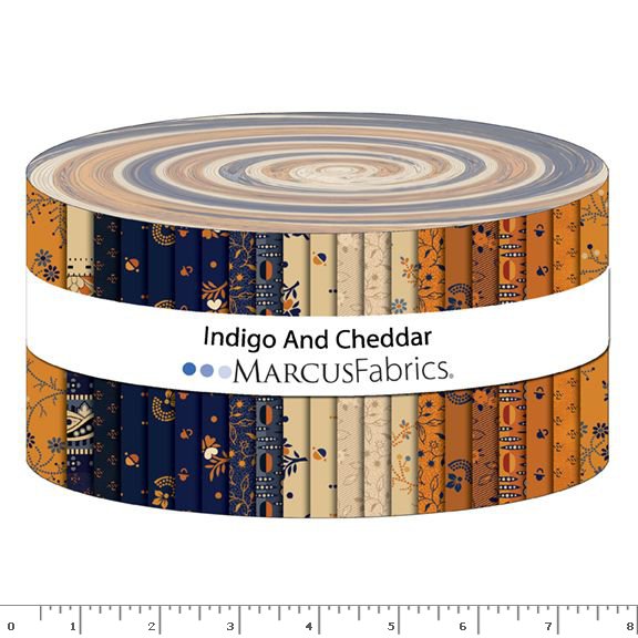 MARCUS FABRICS INDIGO AND CHEDDAR BY JUDIE ROTHERMEL JELLY ROLLS ( 40 2.5" STRIPS)